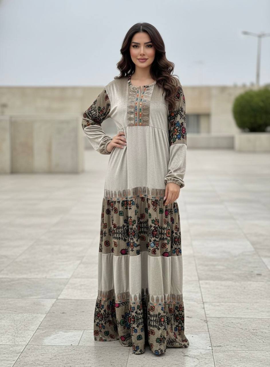العباية دي معمولة عشان تكوني مميزة في أي تجمع عائلي أو استقبال ضيوف. عباية بقصة كلوش واسعة، مزينة بتطريز ورد ألوانه مبهجة جداً ومنسقة على الصدر والأكمام والديل. القماش ناعم جداً وبيدي إحساس بالرقي من أول لمسة.”